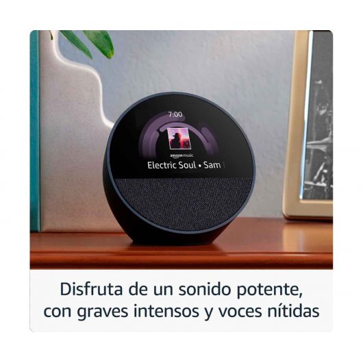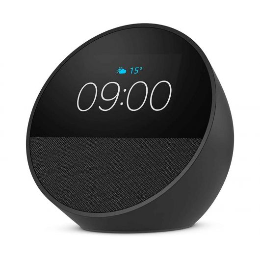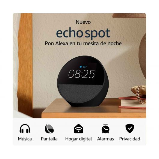 Radio despertador inteligente Amazon Echo Spot en color negro con sonido potente e intenso, empieza el día con buen pie, usa el control por voz, compatible con Alexa