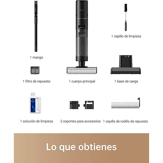 - Autolimpieza exhaustiva durante y después del uso. La función de autolimpieza permite eliminar el pelo y retirar la suciedad para garantizar que se limpia con un cepillo limpio. Se limpia solo mientras limpia el suelo gracias al cepillo raspador dentado. Coloca el aspirador en la base y pulsa el botón para enjuagar bien el rodillo, que gira hacia delante y hacia atrás, y dejarlo totalmente limpio.