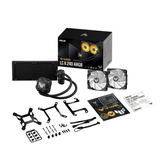 ASUS TUF GAMING LC II 240 ARGB. Tipo: Kit de refrigeración líquida, Diámetro de ventilador: 12 cm, Velocidad de rotación (mín.): 800 RPM, Velocidad de rotación (máx.): 2000 RPM, Nivel de ruido (alta velocidad): 29 dB, Máximo flujo de aire: 67 cfm, flujo de aire: 113,8 m³/h, Presión máxima de aire: 3 mmH2O. Color del producto: Negro
