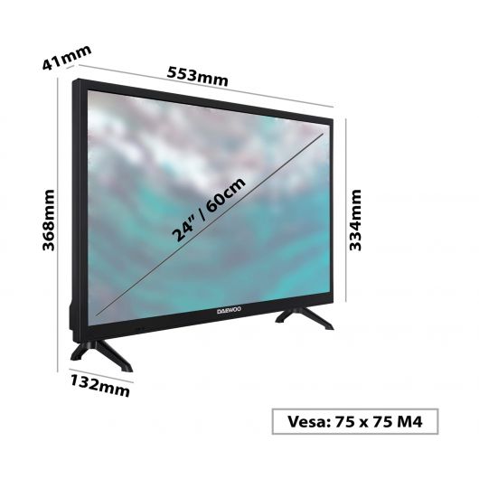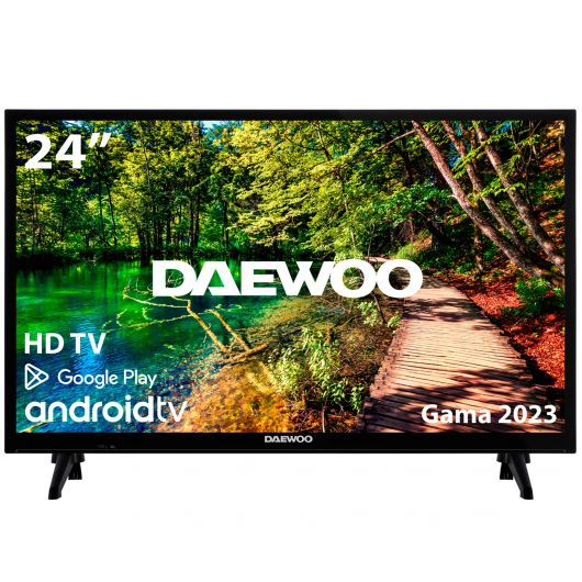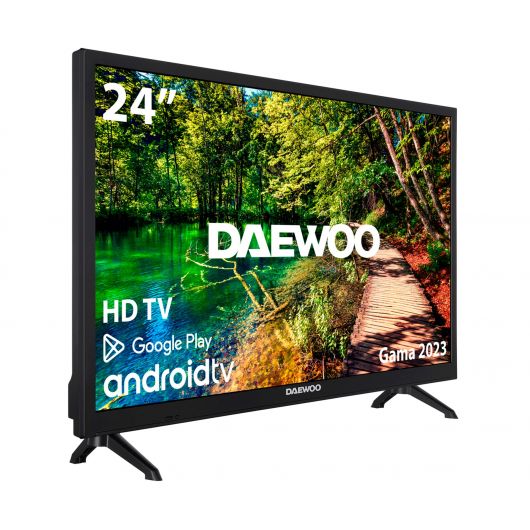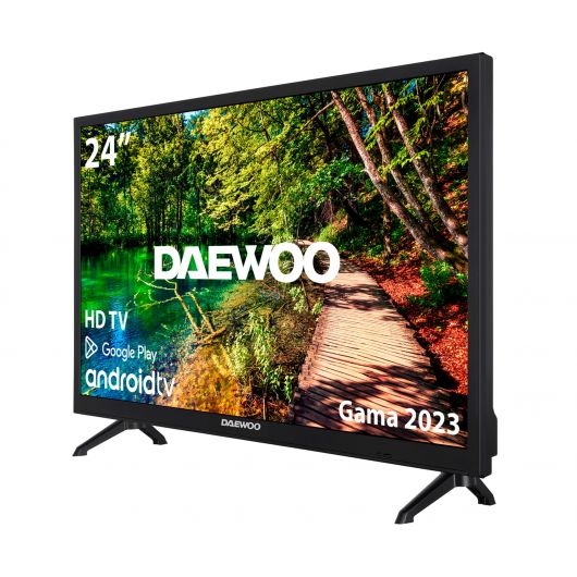 Televisor DAEWOO 24DM64HA en color negro con pantalla de 24′ Direct LED HD+ HDR, 3840 x 2160 píxeles, Smart TV, Android TV con WiFi, bluetooth, asistente de voz y sintonizador satélite, sistema de sonido con 5W en 2.0ch, 3xHDMI, 2xUSB, ethernet, jack 3.5, VGA, AV analógico y CI, compatible con VESA 75×75