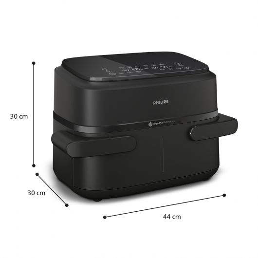 Philips 1000 series Serie 1000. Tipo de producto: Freidora de aire caliente, Capacidad: 7 L, Tecnología de fritura baja en grasas: Rapid Air. Tipo de construcción: Doble, Color del producto: Negro, Tipo de control: Tocar. Tipo de visualizador: LED. Potencia: 2450 W, Voltaje de entrada AC: 220-240 V, Frecuencia de entrada AC: 50 Hz. Ancho: 437 mm, Profundidad: 295 mm, Altura: 301 mm