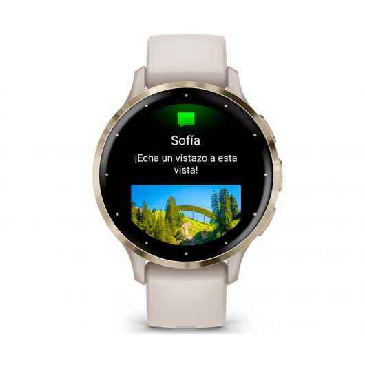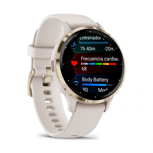 Smartwatch con esfera redonda 41mm GARMIN Venu 3S en color Ivory + Soft Gold con pantalla táctil de 1.4′ AMOLED, conectividad GPS, WiFi, bluetooth y ANT+, modos deportivos y resistencia al agua 5ATM, monitores de frecuencia, sueño, saturación, estrés, ciclo menstrual e hidratación, batería con una duración media de 21 horas