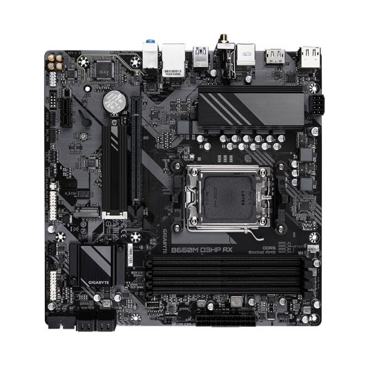 GIGABYTE B650M D3HP AX Placa base – AMD Ryzen serie 9000, VRM de 5+2+2 fases, hasta 7600 MHz DDR5 (OC), 2xPCIe 4.0 M.2, LAN 2,5 GbE, WIFI 6E, USB 3.2 Gen 1. Fabricante de procesador: AMD, Socket de procesador: Zócalo AM5, Procesador compatible: AMD Ryzen 7000 Series, AMD Ryzen 8000 Series, AMD Ryzen 9000 Series. tipos de memoria compatibles: DDR5-SDRAM, Memoria interna máxima: 256 GB, Tipo de ranuras de memoria: DIMM. Interfaces de disco de almacenamiento soportados: M.2, SATA III, Tipos de unidades de almacenamiento admitidas: HDD & SSD, Niveles RAID: 0, 1, 10. Máxima resolución: 4096 x 2160 Pixeles. Tipo de interfaz ethernet: 2.5 Gigabit Ethernet, Controlador LAN: Realtek RTL8125, Estándar Wi-Fi: Wi-Fi 6E (802.11ax)