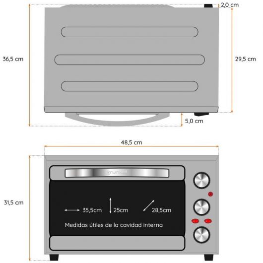 El horno eléctrico GRUNKEL HR-28SILVER es la combinación ideal entre potencia, funcionalidad y diseño compacto. Con 28 litros de capacidad y 1600W de potencia, este horno es perfecto para cocinar pizzas medianas, gratinados, carnes o repostería sin ocupar demasiado espacio. Su función de convección activable por botón independiente mejora la distribución del calor para resultados más homogéneos. Ofrece tres modos de cocción (superior, inferior y doble), selector de temperatura hasta 230°C, temporizador de hasta 60 minutos y botón de luz interior. Las dimensiones exteriores son 49x35x31,5 cm y las interiores 36x27x23 cm, permitiendo un uso cómodo y eficiente. Incluye bandeja, rejilla y asa de extracción. Su diseño en plata con detalles en acero inoxidable y tirador de seguridad de tacto frío garantizan estilo y seguridad.