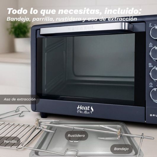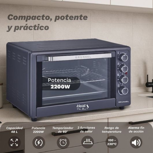 Horno eléctrico de GRUNKEL HR-48PROMAX, 48 L, 2000W, convección independiente, 3 modos, 100-230 °C, luz interior, doble cristal, rustidera y rejilla.