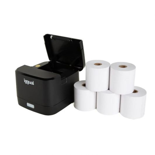 El pack perfecto para tu TPV: impresora térmica TP EASY 58 + 5 rollos de papel térmico BPA free Rendimiento y practicidad se unen en este pack de iggual, que combina la impresora térmica TP EASY 58 con 5 rollos de papel térmico 100 % libres de bisfenol A. Una solución lista para funcionar desde el primer momento, pensada para entornos de venta que valoran la eficiencia, la fiabilidad y el ahorro. La TP EASY 58 ofrece la mejor relación calidad-precio del mercado. Con una velocidad de impresión de 90 mm/s y resolución 203 x 203 dpi, es capaz de generar tickets de hasta 58 mm de ancho, con códigos de barras 1D y 2D, e incluso logotipos de tu marca. Además, gracias a su puerto USB y RJ11, se integra fácilmente con cualquier sistema TPV y permite el control automático de cajones portamonedas. Su diseño compacto no compromete sus prestaciones: esta impresora térmica es ligera, resistente y diseñada para durar, con un cabezal optimizado para imprimir kilómetros de papel. Es compatible con sistemas Windows, Linux, Android e iOS, e incluye adaptador de corriente, cable USB y un primer rollo de papel para que empieces a usarla de inmediato. ¿No quieres quedarte sin papel en un momento crítico Este pack incluye 5 rollos térmicos iggual totalmente compatibles, ideales para mantener tu punto de venta siempre operativo.