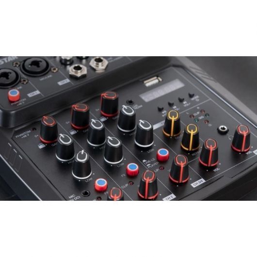 Tiene un tamaño muy reducido y portátil, perfecto para artistas ambulantes, estudios musicales domésticos, pequeños eventos o fiestas, etc. Además, solamente necesita alimentación de 5 V CC, 2’1 A, que puede ser proporcionada por el adaptador, por el puerto USB de un PC o portátil o a través de una power bank, lo que aumenta enormemente la versatilidad y posibilidades de uso de este completo mezclador.