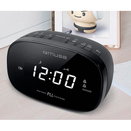 Radio despertador MUSE M-155 CR en color negro con sintonizador FM PLL, doble alarma, LED blanco de 0.6 pulgadas, reloj de 24 horas, funciona con pilas AAA