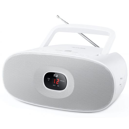 Radio CD portátil MUSE MD-202 RDW en color blanco con altavoz incorporado, antena telescópica y pantalla LED, sintonizador AM, FM y lector de CD, conexión jack 3.5, funciona con pilas 6x C o adaptador de corriente
