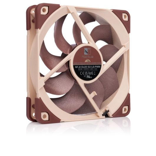 Noctua NF-A12X25 G2 LS-PWM. Tipo: Ventilador, Diámetro de ventilador: 12 cm, Velocidad de rotación (mín.): 850 RPM, Velocidad de rotación (máx.): 1100 RPM, flujo de aire: 66,3 m³/h, Tipo de soporte: Self-Stabilising Oil-pressure Bearing (SSO). Voltaje: 12 V. Ancho: 120 mm, Profundidad: 25 mm, Altura: 120 mm. Color del producto: Beige