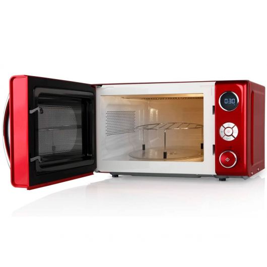 Microondas con grill Orbegozo MIG2042 en color rojo, un microondas con estilo y digital, diseño en rojo y detalles plateados, además de sus 700W de potencia cuenta con un grill de 900W, 20 litros de capacidad y plato de casi 25 centímetros de diámetro. Función de descongelación por peso, temporizador digital de hasta 90 minutos y 10 niveles de potencia para cocinar a la temperatura que necesites. Disponibles 8 menús de cocción automática