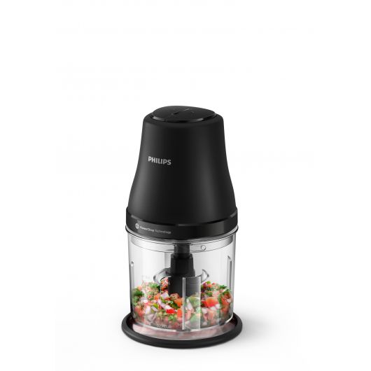 Picadora PHILIPS HR1501/00 en color negro con recipiente de 1L, potencia de 450 W, 2 ajustes de velocidad, 4 cuchillas de acero inoxidable, apto para lavavajillas.