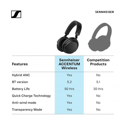 Auriculares OverEar Inalámbricos SENNHEISER ACCENTUM Wireless en color negro con micrófono integrado y cancelación de ruido, conectividad Bluetooth 5.2, batería con hasta 50h de autonomía / 3h de carga con conector USB-C, aplicación Smart Control de Sennheiser para personalizar el sonido