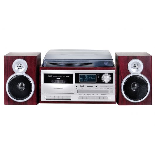 Trevi TT 1072 DAB. Tipo: Tocadiscos de tracción directa, Funcionamiento: Semiautomático, Color del producto: Madera. Forma: Brazo recto. Conector USB: USB tipo A, Auriculares: 3,5 mm. Tipo de visualizador: LCD, Color de luz de fondo: Azul. Tipo de fuente de alimentación: Corriente alterna, Consumo energético: 25 W, Voltaje de entrada de adaptador AC: 110 – 240 V