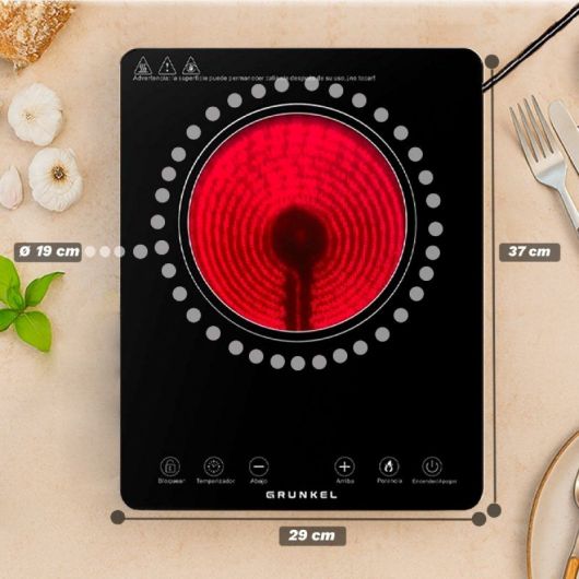 La placa de cocción por infrarrojos GRUNKEL IFR-2000 es una opción moderna, potente y segura para cocinar en cualquier lugar. Su tecnología por infrarrojos calienta de forma directa y uniforme, sin necesidad de utensilios especiales, lo que la hace compatible con todo tipo de ollas y sartenes. Con una potencia de hasta 2000W y 8 niveles ajustables, ofrece un control preciso para diferentes recetas, desde cocción lenta hasta hervidos rápidos. Su superficie de cristal negro de 29×37 cm con marco plateado aporta elegancia y resistencia. Incluye control táctil intuitivo, temporizador programable de hasta 3 horas y bobina calentadora de alta calidad para una mayor durabilidad. Además, incluye bloqueo de seguridad infantil para una mayor tranquilidad en el hogar. Ideal para cocinas pequeñas, apartamentos, segundas residencias o como complemento portátil. Gracias a su tamaño compacto y fácil manejo, es perfecta para quienes buscan versatilidad, eficiencia y estilo en una placa eléctrica moderna.