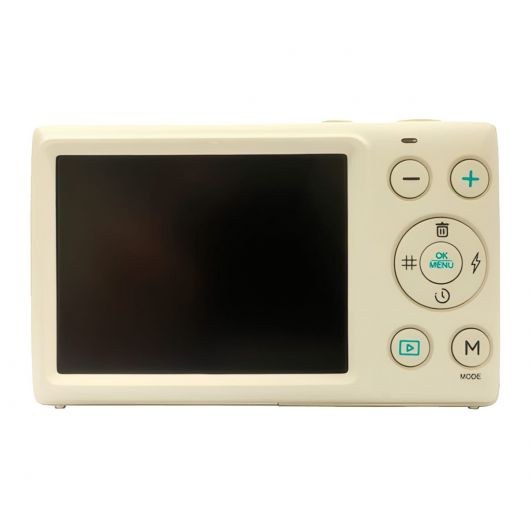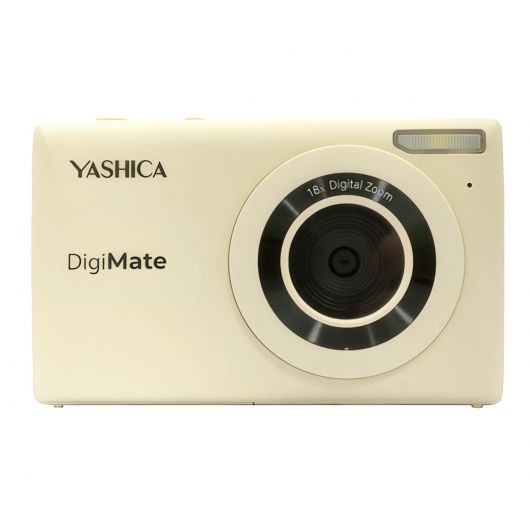 Cámara compacta digital YASHICA DigiMate 100 en color blanco, con resolución de 64 MP, pantalla LCD de 2.7 pulgadas, ISO 100-3200, zoom digital de 18x, linterna LED, almacenamiento externo microSD/TF hasta 128 GB, grabación de vídeos hasta 4K (3840 x 2160 píxeles a 30fps) y conector USB-C